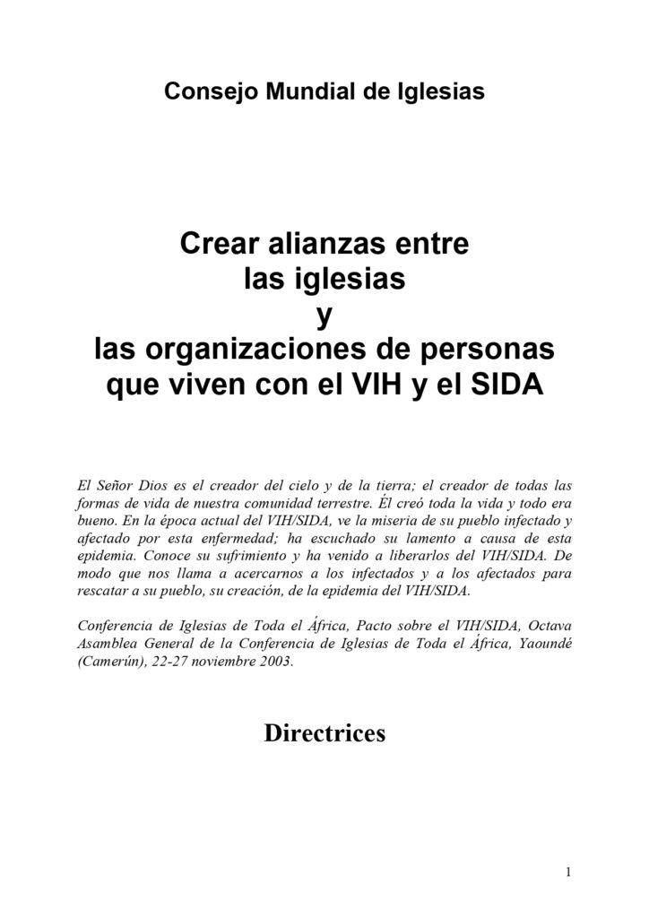 El Consejo Mundial de Iglesias (CMI), conforme a sus compromisos de desempeñar un papel activo en la respuesta al VIH y al SIDA, ha elaborado estas directrices en colaboración con la Red africana de dirigentes religiosos que viven con el VIH y el SIDA o están personalmente afectados (ANERELA+) y la Red mundial de personas que viven con el VIH/SIDA (GNP+). Si bien parte de la información es de carácter general, se hace hincapié en la formación, el desarrollo y el mantenimiento de alianzas con redes, organizaciones y grupos de autoayuda de personas que viven con el VIH y el SIDA (PVVS)…